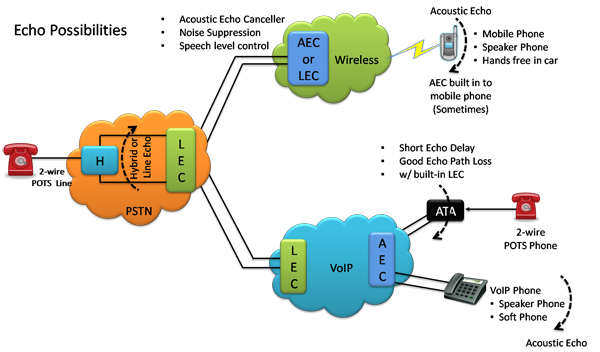 Słyszalność echa utrudnia zrozumiałość rozmowy telefonicznej, gdy nie jest ono wytłumione w sieci i gdy opóźninie sygnału głosu w sieci przekracza ok. 40 ms. Echo elektryczne powodowane jest niedopasowaniem mostka impedacyjnego przy przejściu z linii 4-przewodowej w sieci transmisyjnej na linię 2-przewodową w pętli lokalnej. W sieci VoIP występuje opóźnienie sygnału głosu dużo większe niż 40 ms i echo istniejące w sieci staje się słyszalne.